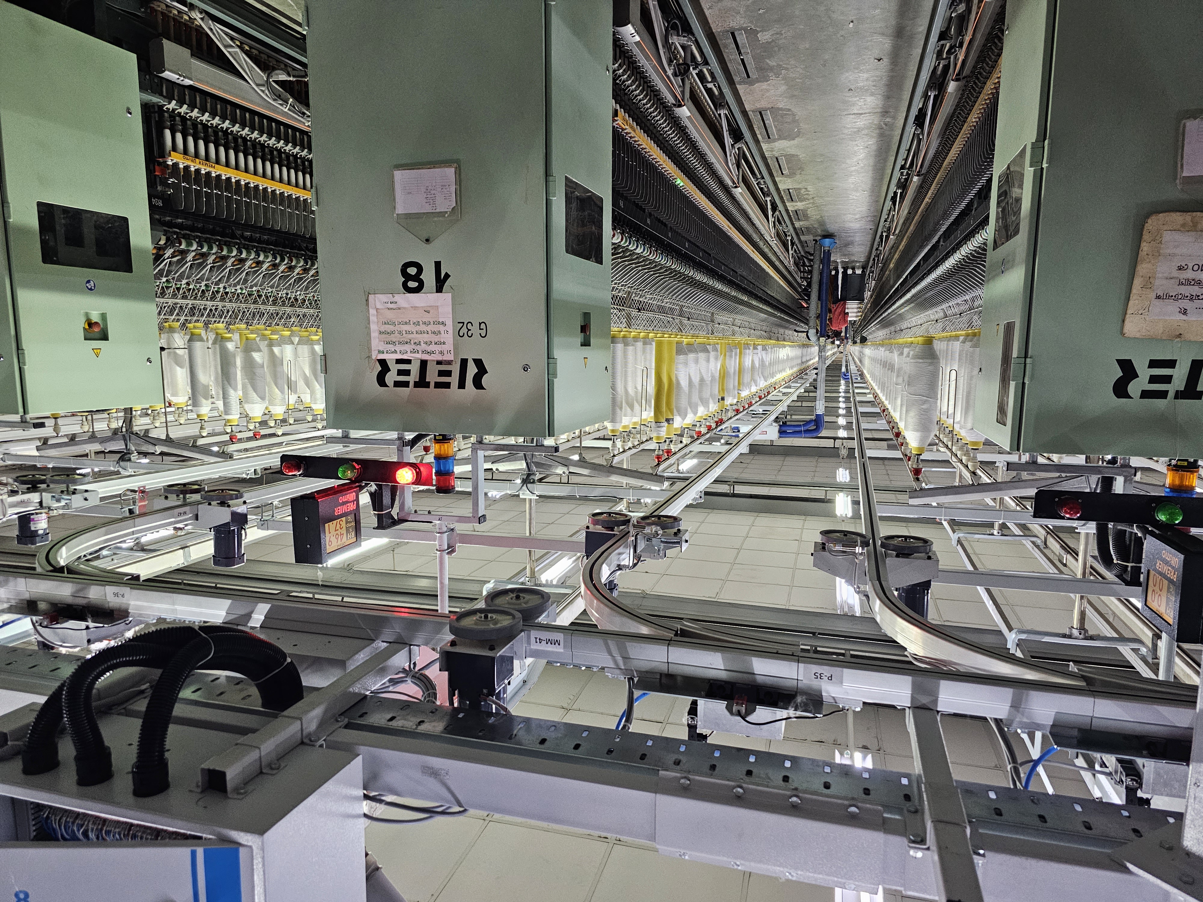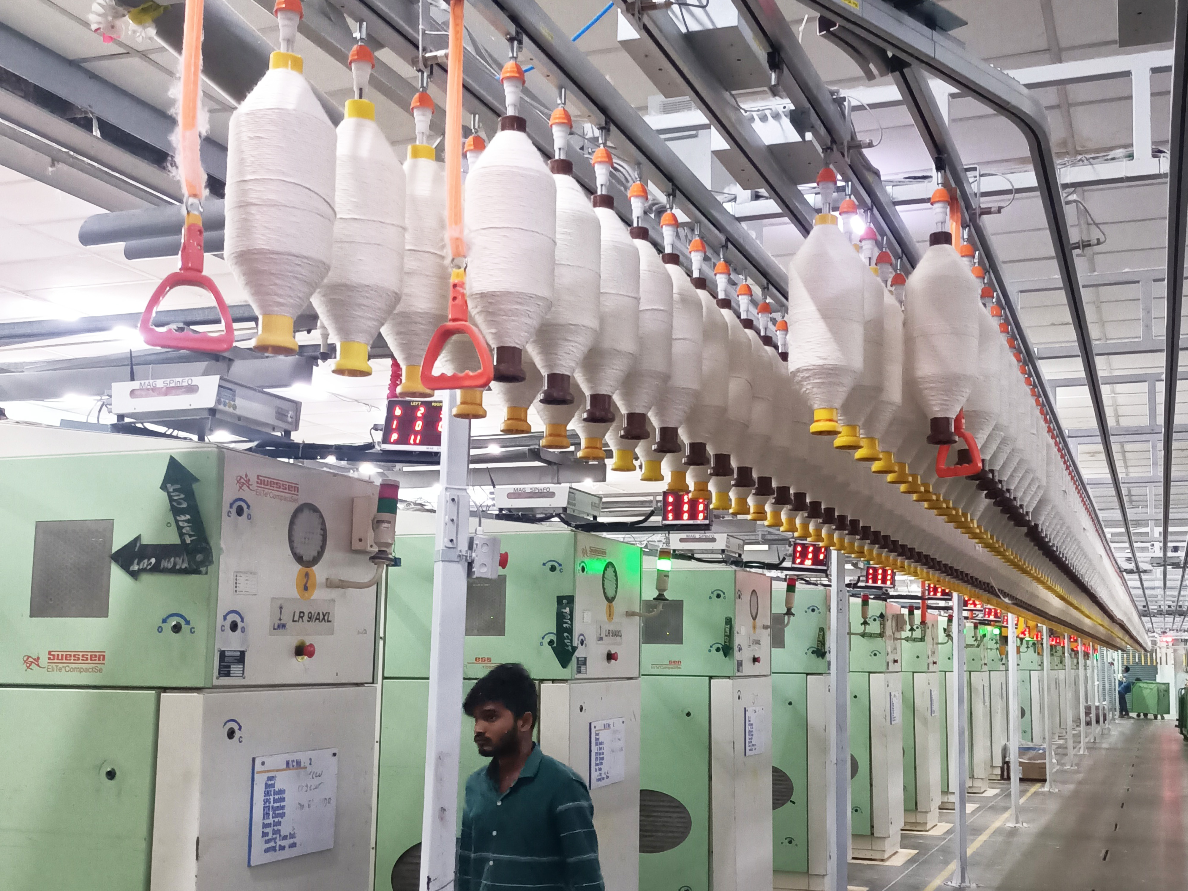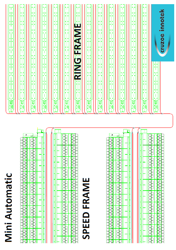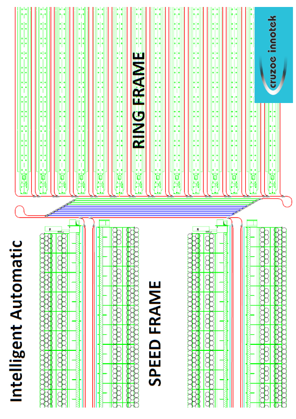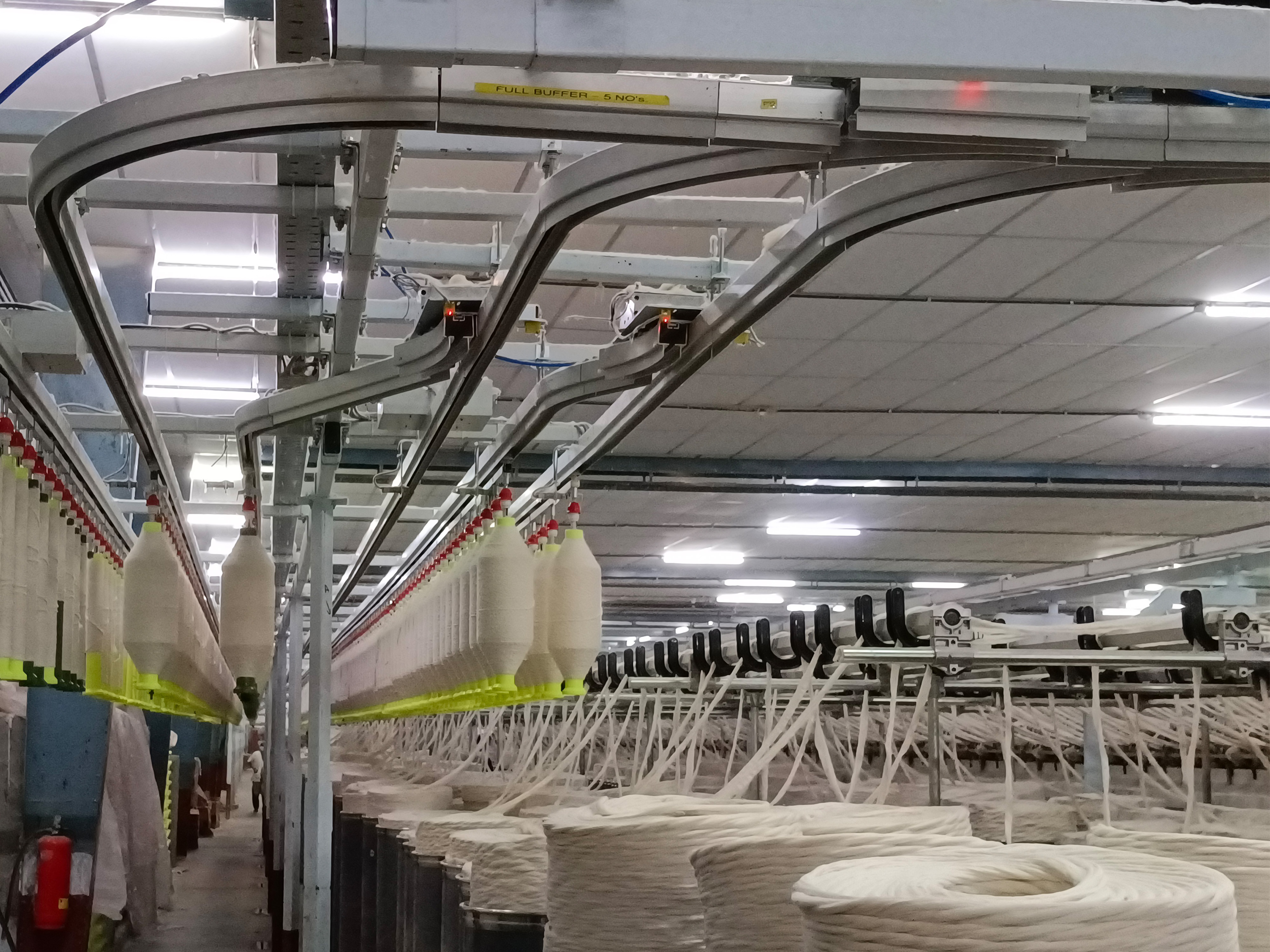 This system uses overhead transport and hence the ground floor is free from movement of trolleys and additional manpower to push the trolleys. It helps to improve quality of the yarn produced by reducing damages of the outer layer of the bobbins due to manual handling and trolley loading. .
